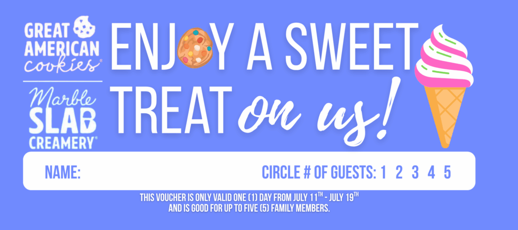 – Vouchers will be available for pickup at the Credit Union OR Great American Cookie beginning July 11th.
